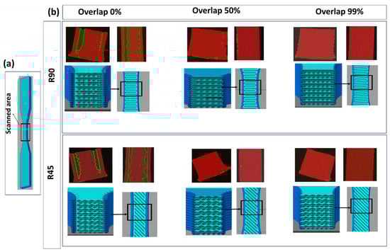 (a) The zone that was scanned for void analysis. (b) Void detection in R90 and R45 groups with different overlaps. The top images for each group show the scanned area by Micro-CT, and the images below show the corresponding slicing image.