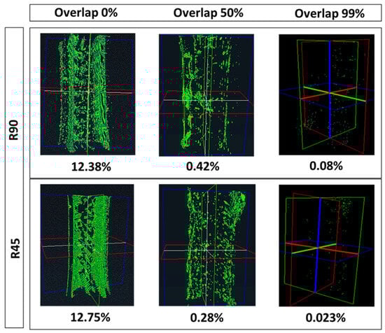 Figure 7 provides insight into how different degrees of overlap influence the void occurrence within the R90 and R45 groups for the dogbone. As is clear from slicing images, the higher percentages of overlap result in closer proximity between the infill and marginal perimeter, thereby reducing the likelihood of void formation. Micro-CT analysis also confirms these observations, where for the groups featuring 0% overlap the integration between infill and perimeter is weak, with instances of non-integration observed in certain areas. However, as overlap increases, the infill infiltrates the perimeter, obviating the presence of gaps. The groups with 99% overlap show complete diffusion, yielding minimal point-dot-shaped voids across the sections.