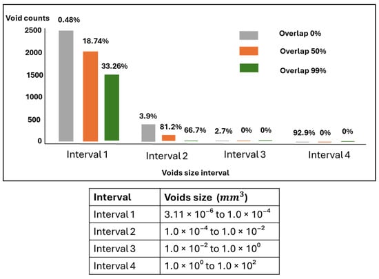 Figure 11 illustrates the distribution of voids across different sizes. Voids in the range of 3.11 × 10−6 to 1.0 × 10−4 mm3 were the most frequent across the three groups, but their impact on the total void volume differed some groups had more significant contributions from larger voids beyond this range. The biggest voids range from 1.0 × 100 to 1.0 × 102 mm3 and indicate the highest contribution in overall void volume despite their lowest numbers in counts. As the overlap decreases, the disparity in void size becomes more uniform, and the volume contribution across different void sizes also decreases.