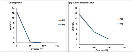 Figure 13a illustrates the mechanical properties of the dogbone at various percentages of overlap. The R90 and R45 groups showed closely comparable patterns of mechanical properties, which align logically with their similar isotropic properties and comparable void volume fractions. At a 99% overlap, both R45 and R90 exhibited the highest values of Young’s modulus, ultimate stress, and ultimate strain, with these values decreasing as the overlap decreased to 0% (Figure 13b).