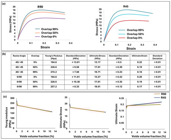 Mechanical properties of dogbone with different raster angles and overlap. (a) Stress–strain diagrams. (b) Young’s modulus, ultimate stress, and ultimate strain. (c) Comparison of void volume fraction and mechanical properties for both raster angles.