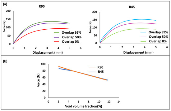 The force and the corresponding displacement for the clip were reported in Figure 13a. It is observed that for R45 and R90, increasing the percentage of overlap improves the overall mechanical properties of the clip. In Figure 14b, the force required for a 1 mm displacement serves as a benchmark for comparing the mechanical properties of clips with different overlaps. A direct correlation between voids and mechanical properties, showing a linear relation, is observed for R45 and R90. At a 99% overlap, where voids constitute approximately 2%, the maximum force required for 1 mm displacement is around 90 N. Conversely, at a 0% overlap with voids at roughly 11%, the minimum force needed for 1 mm displacement is approximately 52.57 N, showcasing a linear response.