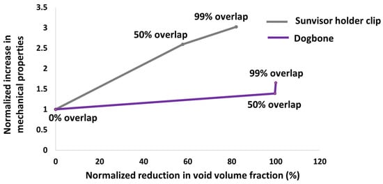 Normalized increase in mechanical properties—elastic modulus for dogbone specimens and applied force at 1 mm displacement for sunvisor holder clips—versus normalized reduction in void volume fraction for both models. Normalization provides comparable benchmark for evaluating effect of void reduction on mechanical performance in these two geometries.