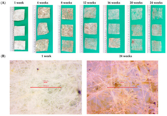 For the sample with the highest degree of biodegradation—PLA.C_1, Figure 2 shows the progress of biodegradation over time. Changes in the structure of the PLA.C_1 nonwoven can also be observed in the images shown in Figure 3—both macroscopic images (A) and under the optical microscope (B).