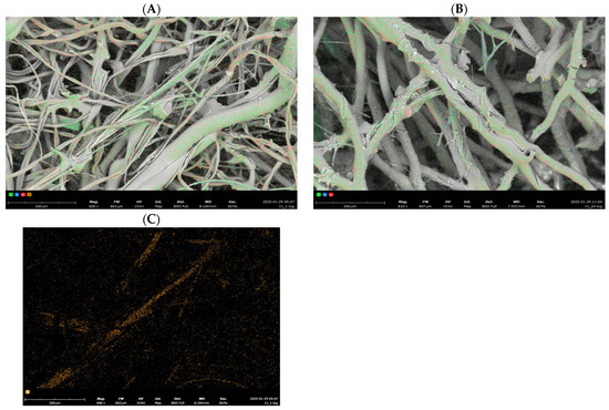 In Figure 4A, three distinct fiber types are visible: fibers with the largest diameter and a smooth surface, identified as PLA; fibers with a significantly smaller diameter, corresponding to cotton; and irregularly shaped structures, representing feathers. Since feathers contain sulfur, the sulfur distribution map (Figure 4C) clearly indicates the presence of feather components in the initial nonwoven fabric.