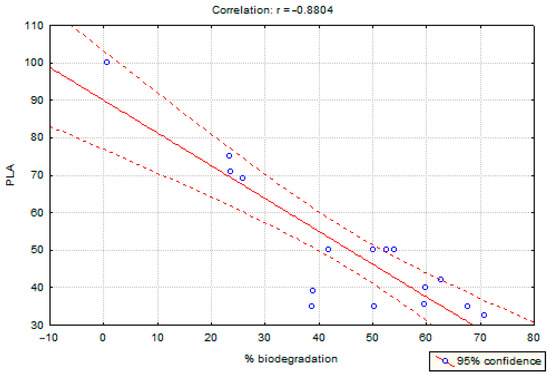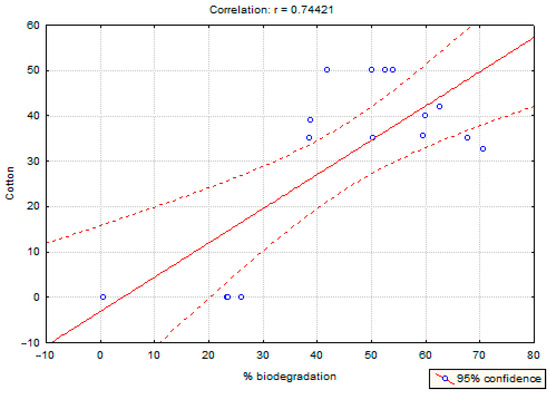 Correlations between selected properties: PLA content (−0.88), cotton content (0.74), feather content (0.17), grammage (−0.38), feather fragmentation degree (0.19), and biodegradation degree were examined. A strong correlation was shown for PLA content (reverse correlation) and cotton (positive correlation). Figure 5 and Figure 6 present the described dependencies. The obtained results show that the higher the PLA content, the lower the degree of decomposition, and the more cotton, the higher the degree of decomposition.