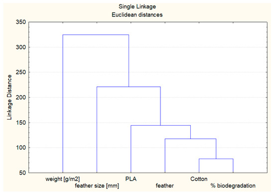 Furthermore, no significant effect of basis weight on the biodegradation rate was observed. Cluster analysis supported these findings, demonstrating that the highest degree of biodegradation occurred in samples composed of PLA, cotton, and poultry feathers.
