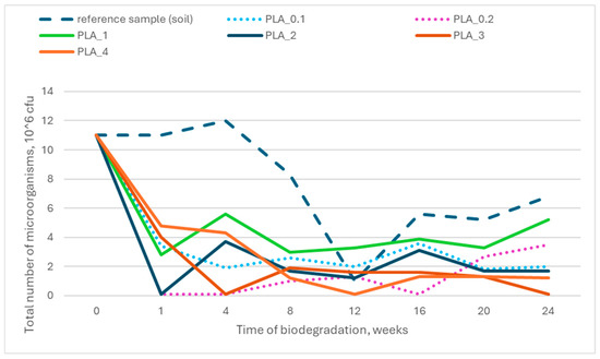 Relationship between total number of microorganisms in soil and time of biodegradation for PLA_x series samples.