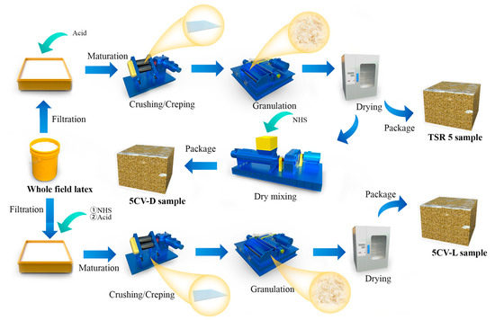 The fresh latex with 0.15% NHS was coagulated with acid. The coagulum was matured for 7 d and subsequently dried at 83 °C to obtain the CV sample labelled 5CV-L.