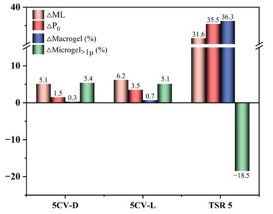 Table 1 shows ML, P0, macrogel, and microgel>1μ for unaccelerated storage and accelerated storage for 48 h. Figure 2 shows the difference of ML, P0, macrogel, and microgel>1μ between accelerated storage for 48 h and unaccelerated storage. As shown in Table 1 and Figure 2, ML and P0 of 5CV-D and 5CV-L increased slightly after 48 h of accelerated storage, while those of TSR 5 showed a significant increase. This is attributed to the fact that the addition of constant viscosity reagent inhibits the cross-linking reactions of the rubber molecular chains. In addition, the CV prepared by the dry-mixing method exhibits superior constant viscosity performance, characterized by lower ∆ML and ∆P0.