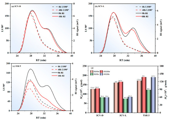 Absolute molecular mass results analysis. (a–c) Refractometer (RI) signals and light scattering (LS, 90°) signals as a function of elution time of three samples; black indicates unaccelerated storage, red indicates accelerated storage for 48 h. (d) Absolute Mw and absolute Mn for three samples.
