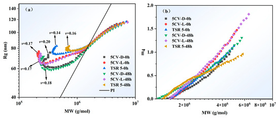 The radius of gyration (Rg) refers to the root mean square distance from all atoms in a molecule to the center of mass, which was used to describe the curl degree and the molecular scale of polymer. The slope (Flory exponent, ν) for the Rg as a function of the absolute Mw of three samples can be utilized to obtain information about the shape of polymer chains [26,27]. The values of ν were 0.14 to 0.20 in Figure 4a, which was much lower than the theoretical values of 0.5 to 0.6 (random coil). This means that the conformation of NR molecule was special. The polyisoprene molecular chain in THF may be compact spherical structure or highly branched molecule [28]. The molecular chains shape of NR would not change with the addition of constant viscosity reagent, nor would it change with the dry-mixing process. The low molecular mass position showed abnormal elution (upsweep). This phenomenon was caused by the co-elution of short molecular chains (low molecular mass) and microgel<1μ [29]. The degree of the abnormal elution would be used to qualitatively analyze microgel<1μ content. A high degree of abnormal elution indicates a high content of microgel<1μ [29,30,31]. Hence, it can be roughly estimated that the microgel<1μ content of 5CV-D is low, while the microgel<1μ content is high. And the quantitative analysis of microgel<1μ content will be investigated in greater depth in the future.
