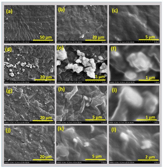 SEM images of different composites at 5 phr filler loading: (a–c) control sample; (d–f) TiO2-based samples; (g–i) MoS2-based samples; (j–l) hybrid samples.