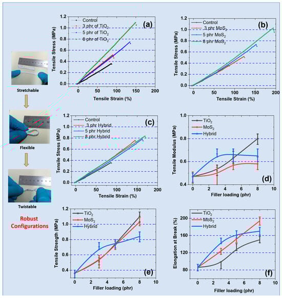 Generally, SR composites exhibit non-linear stress–strain behavior, where the stress increases with increasing strain. This behavior is proposed to occur because of molecular and structural transformation within the composite material under strain [33]. The static mechanical properties were further evaluated under tensile strain. Studying stress–strain is critical for engineering applications that require elasticity, durability, and high mechanical strength. Therefore, Figure 3a–c shows the stress–strain behavior of the composites under tensile strain. The results show higher stress under increasing strain until fracture. At low strain, these rubber composites exhibit elastic behavior, and the complete recovery of properties is witnessed, agreeing with the literature [34]. However, as the magnitude of strain increases to higher values, various reinforcing mechanisms come into existence. For example, the molecular chains of the SR matrix begin to stretch, and filler particles tend to align in the direction of the applied force. These features help in reducing entropy and increasing stiffness [35]. Moreover, the reinforcing effect of TiO2 and MoS2 enhances stress transfer within the composite sample, thereby increasing resistance to mechanical deformation.