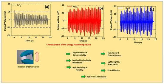 Electro-mechanical aspects of the composites at 5 phr under a 30% cyclic compressive strain: (a–c) output voltage vs. time for TiO2-, MoS2-, and hybrid-based composites.