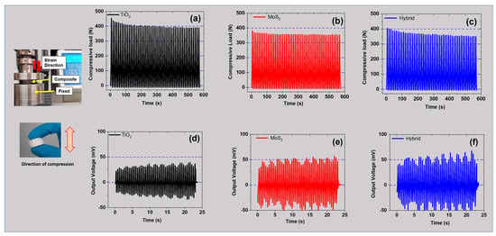 Properties at 5 phr under a 30% compressive cyclic strain: (a–c) compressive load vs. time for TiO2-, MoS2-, and hybrid-based composites; (d–f) output voltage vs. time for TiO2-, MoS2-, and hybrid-based composites.