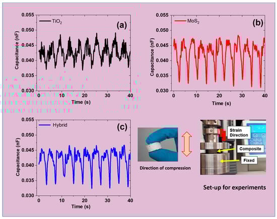 Capacitance of the different composites samples at 5 phr loading under a 30% compressive cycling strain: (a) TiO2 sample; (b) MoS2 sample; and (c) hybrid sample.