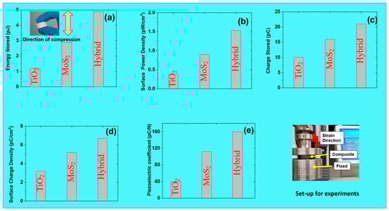 The use of PENGs as energy sources, especially for portable devices and remote areas, is continuously increasing nowadays. This is due to their easy-to-use, portable nature, with no need for charging stations like traditional batteries [60]. Here, energy parameters like energy stored, power density, charge density, and piezoelectric coefficient are studied (Figure 8a–d). All the energy parameters are derived from capacitance, as detailed in Figure 7. The results show that for almost all parameters, the energy output is better for the hybrid system than TiO2 or MoS2 as the only filler. For example, the surface power density was 0.38 pW/cm2 (TiO2), 0.90 pW/cm2 (MoS2), and finally 1.53 pW/cm2 (hybrid). This is due to charge transport and the accumulation of higher charge for the hybrid filler system compared to the TiO2- and MoS2-only filler systems. This charge transport mechanism favors higher energy output and current, thereby boosting the power density [61]. Moreover, the hybrid system provides better stress distribution, thereby improving mechanical stability. Similarly, the surface charge density was 3.18 pC/cm2 (TiO2), 5.09 pC/cm2 (MoS2), and finally 6.69 pC/cm2 (hybrid). Here, the hybrid filler provides improved strain-induced polarization in piezoelectric applications. However, the hybrid filler system creates a heterostructure, thereby increasing active surface area for charge accumulation [62]. Therefore, the high interfacial polarization creates better charge density for the hybrid filler system. These results also suggest that TiO2 and MoS2 may be synergized in a hybrid system. For example, TiO2 improves mechanical stability and reinforcement. Moreover, MoS2 improves fatigue properties, thereby balancing the hybrid system with good overall properties [63]. Therefore, this trend highlights that energy generation is best and most balanced for hybrid systems.
