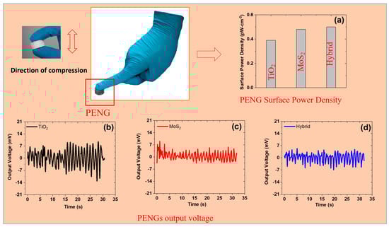 In addition to measuring power density in the lab using the UTS machine, it is important to achieve this power in real time. Here, we demonstrate power generation through human motions like finger pressing of the PENG devices (Figure 9). As detailed above, the power density was best for the hybrid filler system, compared to TiO2 and MoS2 single-filler systems (Figure 9a). For example, the surface power density was ~0.39 ± 0.03 pW/cm2 (TiO2), ~0.48 ± 0.04 pW/cm2 (MoS2), and ~0.5 ± 0.04 pW/cm2 (hybrid filler). Thus, these results agree with the above results obtained through universal testing in lab conditions. Here, the hybrid fillers exhibit synergism and enhance the piezoelectric strain response. Moreover, they also provide a stronger polarization effect in composite materials [67]. Therefore, higher energy output can be achieved under human motions like finger pressing compared to that achieved with TiO2 or MoS2 as a single filler. Moreover, the finger pressing of the hybrid composite allows for more efficient energy generation under constant pressing of the PENG device. This helps in achieving consistent power even at low strain or with irregular human motions [68]. Also, the hybrid filler system enhances piezoelectric charge transfer, thereby leading to higher power density compared to systems with TiO2 or MoS2 as a single filler.