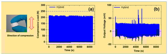 The durability of a composite under cyclic compressive strain is an important factor for its use in energy-harvesting-related applications. To enhance the durability and load-bearing mechanical properties, reinforcing fillers are often added [72]. Here, TiO2 and MoS2 were added to the SR matrix as hybrid fillers. TiO2 was added to improve reinforcing properties, while MoS2 was added to improve tribological properties. Figure 10a shows that the compressive load was stable for up to 3000 cycles without any mechanical failure. This shows that the hybrid filler system developed in this work has excellent prospects for long-term operation. As described earlier, TiO2 and MoS2 act as an optimum and balanced filler for obtaining great durability characteristics. Various factors affect durability, such as filler dispersion, filler content, and environmental factors like humidity [73]. Here, the filler dispersion was optimum for the 5 phr hybrid filler, as justified in Figure 1, which thus supports stable durability. Furthermore, the filler content was optimum, as it was free from large aggregates and agglomerates, and thus supports stable durability. Finally, stable and optimum environmental conditions like humidity promote good durability features. Therefore, the hybrid system developed in this work provides balanced and stable durability. Moreover, it represents a promising candidate for use on an industrial scale.