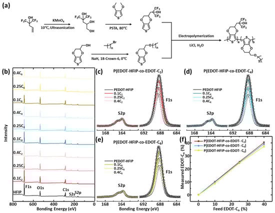 (a) Schematic presentation of chemical pathway of EDOT-HFIP monomer, EDOT-Cn monomer, and P(EDOT-HFIP-co-EDOT-Cn). (b–e) XPS survey spectra and high-resolution S2p and F1s spectra of P(EDOT-HFIP-co-EDOT-C2)s, P(EDOT-HFIP-co-EDOT-C4)s, and P(EDOT-HFIP-co-EDOT-C6)s prepared with EDOT-C2/C4/C6 feed ratios of 0, 0.1, 0.25, and 0.4. These copolymer films were dip-coated onto pristine silica substrate. (f) Plots of EDOT-Cn compositions of P(EDOT-HFIP-co-EDOT-C2)s, P(EDOT-HFIP-co-EDOT-C4)s, and P(EDOT-HFIP-co-EDOT-C6)s, estimated from high-resolution spectral data (c–e).