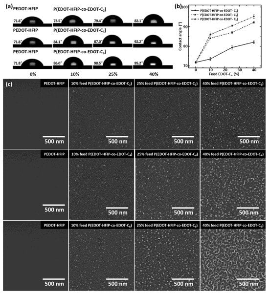 (a) Water static contact angles of PEDOT-HFIP and P(EDOT-HFIP-co-EDOT-Cn) thin films spin-coated onto plasma-treated silica substrates. (b) Plots of water static contact angles as function of EDOT-Cn feed ratio for P(EDOT-HFIP-co-EDOT-C2), P(EDOT-HFIP-co-EDOT-C4), and P(EDOT-HFIP-co-EDOT-C6) thin films. (c) SEM images of PEDOT-HFIP, P(EDOT-HFIP-co-EDOT-C2), P(EDOT-HFIP-co-EDOT-C4), and P(EDOT-HFIP-co-EDOT-C6) thin films.