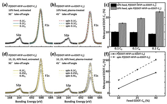 (a) Normalized high-resolution S2p and F1s spectra collected at 90° take-off angle for the P(EDOT-HFIP-co-0.1EDOT-Cn) synthesized under a 10% EDOT-Cn feed ratio and dip-coated on untreated silica substrates. (b) Normalized XPS high-resolution S2p and F1s spectra collected at 45° take-off angle for the P(EDOT-HFIP-co-0.1EDOT-Cn) copolymers synthesized under a 10% EDOT-Cn feed ratio and spin-coated on plasma-treated silica substrates. (c) Comparison of the EDOT-Cn compositions determined by the above XPS data between the P(EDOT-HFIP-co-0.1EDOT-Cn) films coated on the pristine silica substrate and those coated on the plasma-treated silica substrates. (d) Normalized high-resolution S2p and F1s spectra collected at 90° take-off angle for the P(EDOT-HFIP-co-EDOT-C6)s synthesized under 10%, 25%, and 40% EDOT-Cn feed ratios and dip-coated on untreated silica substrates. (e) Normalized high-resolution S2p and F1s spectra collected at 45° take-off angle for the P(EDOT-HFIP-co-EDOT-C6) synthesized under 10%, 25%, and 40% EDOT-Cn feed ratios and spin-coated on the plasma-treated silica substrates. (f) A comparison of the compositions, as determined by the XPS data, for the P(EDOT-HFIP-co-EDOT-C6) synthesized with EDOT-Cn feed ratios of 10%, 25%, and 40% and dip-coated on pristine silica substrates and spin-coated on plasma-treated silica substrates.