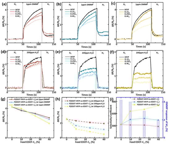 As our primary concern was whether the sensing material’s ability to resist water vapor interference aligned with the original molecular design intent, we first evaluated the water resistance of these chemiresistive sensors by focusing on the effects of the copolymer compositions and the alkyl group lengths. Since the sensor’s response to water vapor was much smaller than its response to DMMP, we set the water vapor concentration to a very high value of 200 ppm to enhance the accuracy of the evaluation. During the measurement, the chemiresistive sensors were continuously subjected to a 50 s nitrogen (N2) gas purge, followed by exposure to 200 ppm of water vapor for 60 s to induce a resistive response, and then purged again with N2. The real-time resistance change was monitored for each P(EDOT-HFIP-co-EDOT-Cn) sensor, as shown in Figure 4a–c, with the PEDOT-HFIP one as the control. The resistance change rates of the various polymers over 60 s are summarized in Figure 4g as a function of the EDOT-Cn feed ratios. As expected, the resistive response of the P(EDOT-HFIP-co-EDOT-C2) sensor decreased linearly with an increase in the EDOT-C2 feed ratio. However, the responses of the P(EDOT-HFIP-co-EDOT-C4) and P(EDOT-HFIP-co-EDOT-C6) sensors differed in their dependence on the EDOT-Cn feed ratio, with a significant drop at a 0.1 EDOT-Cn feed ratio, followed by a gradual decrease in the response as the EDOT-Cn feed ratio increased further. In detail, the water vapor responses of the P(EDOT-HFIP-co-EDOT-C2), P(EDOT-HFIP-co-EDOT-C4), and P(EDOT-HFIP-co-EDOT-C6) sensors decreased by 7.0%, 33.6%, and 51.5%, respectively. Notably, the P(EDOT-HFIP-co-EDOT-C6) sensor exhibited an impressive 51.5% decrease in water vapor response with only ~10% EDOT-C6. We are keen to delve into the underlying reasons for this phenomenon, and a detailed analysis will be presented later.