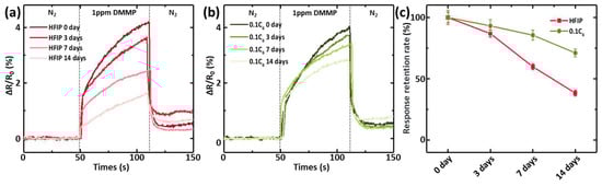 Chemiresistive sensors typically feature high sensitivity and a low detection limit, making storage in a dry inert gas atmosphere generally necessary. Storing these chemiresistive sensors on a shelf without specialized protection remains very challenging, particularly for those with a ppb detection limit [23]. To evaluate the impact of the surface-driven phase-segregation strategy on the shelf storage stability of these chemical sensors, we exposed them directly to the air for 14 days in our electronic device fabrication cleanroom (class 10,000), with the temperature and humidity of the environment maintained at 20–25 °C and 50–70%, respectively. During the storage period, the response of the chemiresistive sensor integrated with P(EDOT-HFIP-co-EDOT-C6) containing 10% EDOT-C6 was monitored, with the PEDOT-HFIP sensor as the control. As illustrated in Figure 5a–c, the response of the PEDOT-HFIP sensor to 1 ppm DMMP experienced a dramatic degradation of 61.7% over the 14 days of storage. In contrast, the P(EDOT-HFIP-co-EDOT-C6) sensor demonstrated a significantly improved shelf storage stability, with only a 28.9% reduction in sensitivity after the same 14-day shelf storage period. This significant enhancement in shelf storage stability can be attributed to the improved water resistance of the P(EDOT-HFIP-co-EDOT-C6) sensor. Additionally, the presence of organic solvent molecules in the cleanroom atmosphere, even at potentially low concentrations, may have introduced another challenge for the sensor, contributing to its degradation. We plan to investigate and address this issue in future studies.