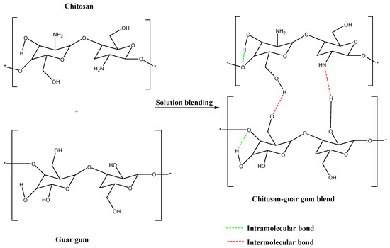 Schematic illustration of chitosan and guar gum blend via hydrogen bonding. * indicates repeating polymer units.