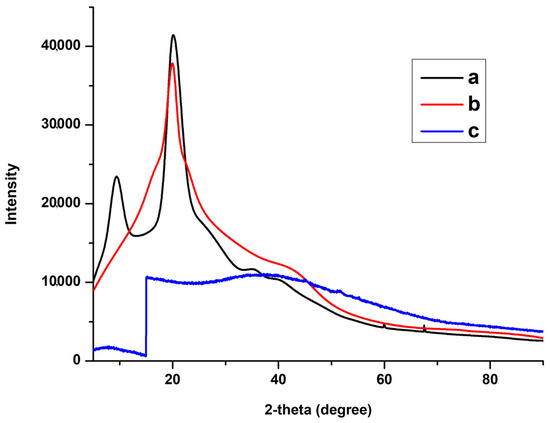 XRD spectra of (a) CS, (b) GG, and (c) CS-GG polymer blend.