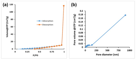Table 1 shows the specific CS-GG pore surface area, pore volume, and pore diameter characteristics. Therefore, CS-GG’s specific pore surface area, volume, and diameter were found to be 11.843 (m2/g), 0.184 (cm2/g), and 17.072 nm, correspondingly. The mean pore diameter measurement of 17.072 indicates that CS-GG has a mesoporous structure, with pores ranging from 2.0 nm to 50 nm, according to IUPAC. Figure 6 shows the BJH pore width distribution and N2 adsorption–desorption isotherms for CS-GG. Based on the results, the CS-GG N2 adsorption–desorption isotherm could be categorized as Type-IV, thus demonstrating that a sizable portion of their structure is mesoporous [37,38].