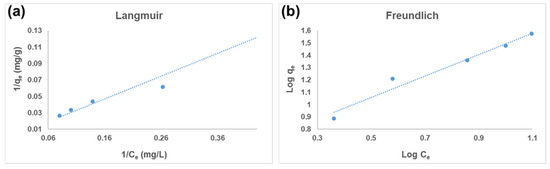 where Ce is the adsorbate’s equilibrium concentration (mg/L), is the maximal adsorption capacity (mg/g), is the Langmuir adsorption constant (L/mg), and qe is the quantity of adsorbed metal ions at equilibrium (mg/g).