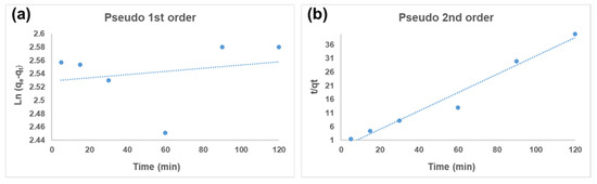 where k1 is the pseudo-first-order rate constant for the adsorption process (min−1), and qe and qt represent the quantities of Hg2+ adsorbed (mg/L) on the CS-GG blend at equilibrium and at a time t (min), respectively. A very low correlation coefficient (R2 = 0.0507) was obtained from the plot of ln (qe − qt) versus t, displayed in Figure 10a. This suggests that the CS-GG blend’s Hg2+ ion adsorption could not adhere to pseudo-first-order kinetics.
