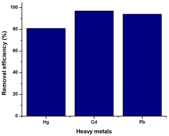The co-existing ions were employed to evaluate the blend’s selectivity for the removal of mercury ions in the presence of Cd2+ and Pb2+ co-metal ions. The removal of mercury ions was slightly affected in the presence of the two co-metals, where it followed the Cd2+ ˃ Pb2+ ˃ Hg2+ (97; 94; 81) sequence, as shown in Figure 11. This might be attributed to the difference in the ionic radii [50]. It might also be due to Cd2+ and Pb2+ having higher correlation abilities with the functional groups of the CS-GG blend compared to Hg2+ [51].