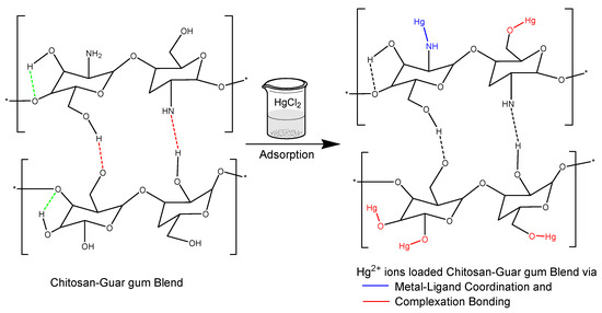 Proposed schematic adsorption mechanism of Hg2+ ions on the Chitosan–Guar gum blend. * indicates repeating polymer units.