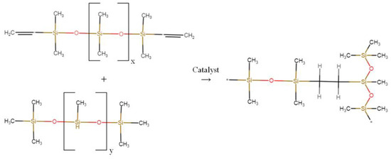 A high-strength, non-shrink silicone compound Pentelast-750 of grade A (New Composite, Saint Petersburg, Russia) was used as a silicone matrix. Pentelast-750 is a two-component compound consisting of component A and component B, which, when mixed, hardens at room temperature according to the following reaction (Figure 1):
