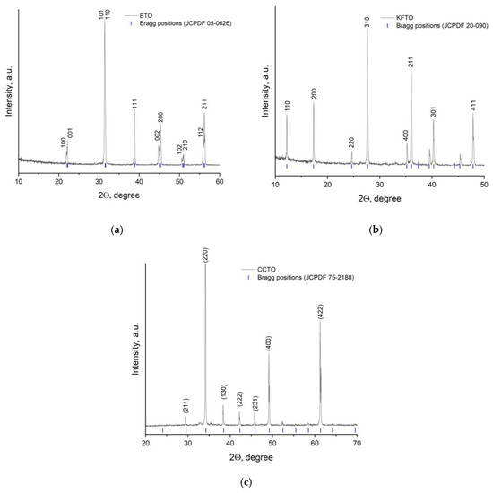 All synthesized ceramic powders are described by X-ray diffraction patterns; they are characterized by a crystalline structure and are monophasic. According to XRD data, BTO powder has a perovskite tetragonal crystal structure (space group P4mm). Observed diffraction peaks at 2θ = 22°, 32°, 39°, 45°, 51°, and 56° correspond to the planes of (100), (110), (111), (200), (210), and (211), respectively. The X-ray diffraction pattern of KFTO powder includes the diffraction peaks at 2θ = 12°, 18°, 25°, 28°, 35°, 36°, 39°, 40°, 46°, and 48°, related to the priderite phase with a tetragonal hollandite-like structure (space group l4/m). The XRD pattern of CCTO powder also has several characteristic peaks at 2θ = 29°, 34°, 38°, 42°, 46°, 49°, and 62°, confirming the formation of a body-centered cubic perovskite structure (space group Im3). It should be noted that in all cases there are no secondary crystalline phases, which indicates the successful synthesis of materials by the selected methods.