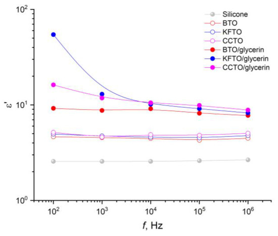 The permittivity of silicone in the range studied is a frequency-independent and maintains a value at the level of 2.6 units. The addition of ceramic fillers (BTO, KFTO, CCTO) in an independent form does not change the behavior of frequency dependence but leads to an increase in the permittivity up about to 5 units. However, the addition of the same ceramic fillers in combination with glycerin causes a simultaneous increase in the permittivity in the entire frequency range studied, especially in the low-frequency region (102–103 Hz). In this case, it is necessary to note the influence of the type of ceramic filler in the low-frequency region. At f = 102–103 Hz, the highest permittivity is demonstrated by silicone with KFTO as a filler, with the lowest by silicone with BTO. The described behavior is normal for such composites [36,37,38].