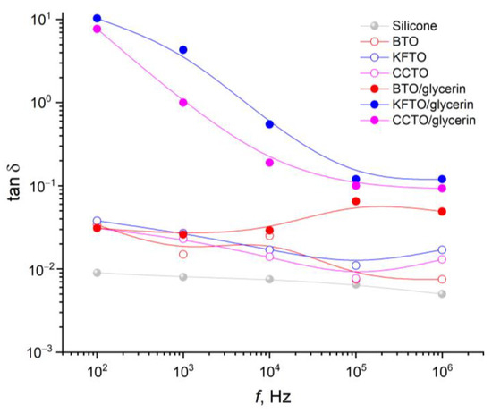 By analogy with the permittivity, the addition of fillers leads to an increase in the dielectric loss tangent relative to pure silicone, characterized by tanδ = 0.01 (Figure 9). Ceramic fillers cause almost the same and less significant increase in tanδ up to about 0.03. In combination with glycerin, this increase is more significant, especially in the low-frequency range, up to 10 units.
