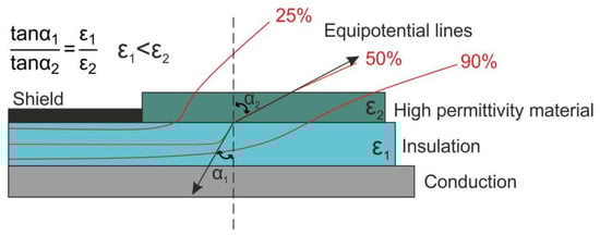 In recent decades, there has been a significant increase in attention to the application of high-voltage pulse technology for well drilling, mineral disintegration, concrete and reinforced concrete demolition, electronic device recycling, high-voltage lines in power supply systems for multigenerator microwave installations, and other similar tasks [1,2]. Effective insulation of high-voltage equipment is a complex task, since it is necessary to take into account the change in the direction of the electric field lines in places where the integrity of the main insulation with high electrical strength and low permittivity is broken [3,4,5]. A similar problem arises when designing the electrode unit of electric pulse installations, for example, for the destruction of concrete, since it is necessary to direct the equipotential fields as much as possible in the same direction as the electrodes. One of the solutions for aligning high-tension electric field lines of high-voltage equipment is the refraction method of alignment of the electric field [6,7]. The essence of the method is to use an external insulating shell with a permittivity significantly exceeding the permittivity of the main insulator.