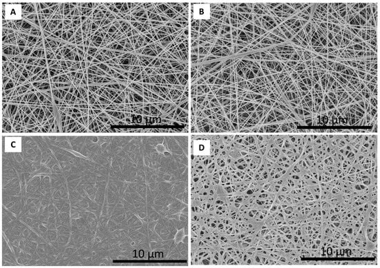 In Figure 1, the crosslinked systems are observed. Adding AIBN to the PVA:MChi system and heating for crosslinking at 115 °C resulted in fibers with a diameter of 0.14 ± 0.03 µm (Figure 1A). V50 was added and after being subjected to a thermal treatment at 65 °C for 24 h, fibers with a diameter of 0.15 ± 0.05 µm were obtained (Figure 1B). As observed, the fiber diameter increased following thermal crosslinking. This can be explained by the structural rearrangement required by the chains. Since the radicals generated in the methacrylate groups have only one reaction site, they needed to interact with the double bonds of other methacrylate groups. Due to heat diffusion and the torsional stress of the chains, the distance between the chains increased to facilitate crosslinking.