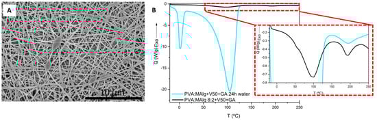 PVA:MAlg 8:2 8% electrospinning membrane after dual crosslinking with V50 and GA after 24 h exposure to water: (A) SEM image at 5000× magnification and (B) DSC thermograms of the same sample before being exposed to water (black) and after 24 h exposure to water (blue). Dotted lines show an enlargement of the signaled area.