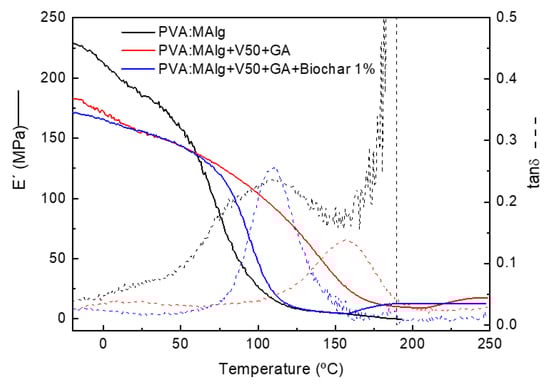 For this reason, it was decided to study the mechanical properties of different PVA:MAlg systems using dynamic mechanical analysis (DMA). DMA results presented in Figure 5 illustrate E′ and tan δ as a function of temperature for the alginate-based systems. The black curves correspond to crosslinker-free PVA:MAlg membrane, the red curves represent the sample subjected to dual crosslinking, and the blue curves show the performance of the sample containing 1% biocharcoal particles and subjected to dual crosslinking. All the samples exhibited a similar E′ of approximately 150–180 MPa at room temperature. The uncrosslinked sample had a slightly higher modulus, with a small decrease occurring when crosslinking the sample without or with biochar. In the case of the biochar addition, it was already reported [38] that the addition of biochar resulted in a decrease of E’. As the temperature increased, as seen in Figure 5, the E′ decreased due to the softening of the sample when passing from a glassy to a rubbery state. This caused an increase in tan δ at the peak of which the glass transition temperature (Tg) can be determined. Thus, the Tg of the neat Alg material was approximately 110 °C, with a rather broad peak in tan δ, while the dual crosslinked samples (red curves) tan δ peak shifted to ~160 °C. However, the pristine membrane (black curves) underwent melting at higher temperatures (around 180–200 °C), possibly due to the high PVA content. This melting disappeared when the sample was crosslinked, not only improving its thermal resistance but also, as already mentioned, making it insoluble in water.