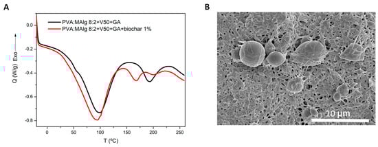 Analysis of PVA:MAlg 8:2 after dual crosslinked samples: (A) DSC thermograms (without and with biochar 1%) and (B) the SEM image of the sample with 1% biocharcoal after exposure to water for 48 h.
