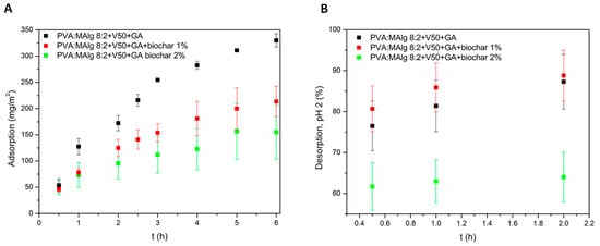 Given the intended application of these membranes for the removal of water pollutants, a crucial step in their evaluation involved assessing their adsorption and desorption capacities. After a comprehensive characterization of their morphology using SEM analysis, along with their mechanical and thermal properties, the next phase of this study focused on evaluating their ability to adsorb MB, a model contaminant commonly used in water treatment research. Subsequently, desorption experiments were conducted to determine the extent to which the membranes can be regenerated and reused. These findings provided essential insights into the feasibility of employing these electrospun biopolymer-based membranes as efficient and sustainable adsorbents for wastewater remediation. MB adsorption performance of the developed materials over time is depicted in Figure 7A, comparing three different systems: (i) PVA:MAlg 8:2 + V50 + GA (black), (ii) PVA:MAlg 8:2 + V50 + GA + biochar 1% (red), and (iii) PVA:MAlg 8:2 + V50 + GA + biochar 2% (green). The adsorption capacity (mg/m2) was monitored for up to 6 h, providing insights into the influence of biochar content on the adsorption efficiency.