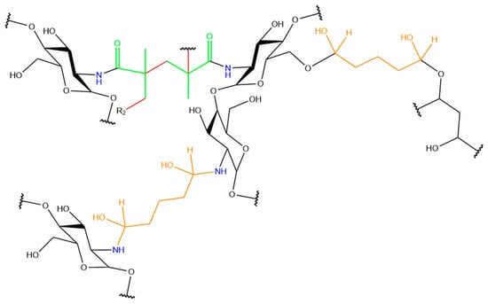 An example of crosslinking of PVA:MChi sample: in green is the methacrylate group; in red are bonds created by V50 crosslinking between methacrylate double bonds; in yellow, crosslinking from GA.