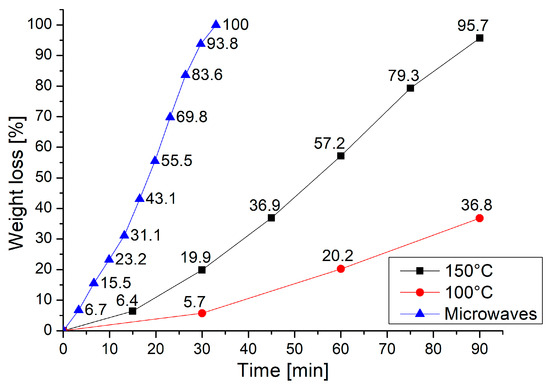 Furthermore, a comparison between the microwave and conventional oven was also performed. Tests were performed at different temperatures (100–150 °C) using a vented oven (Carbolite, Thetford, UK—3000 W). The duration of each cycle at 100 °C is 30 min, at 150 °C it is 15 min, and at the end of each cycle the weight loss was calculated.
