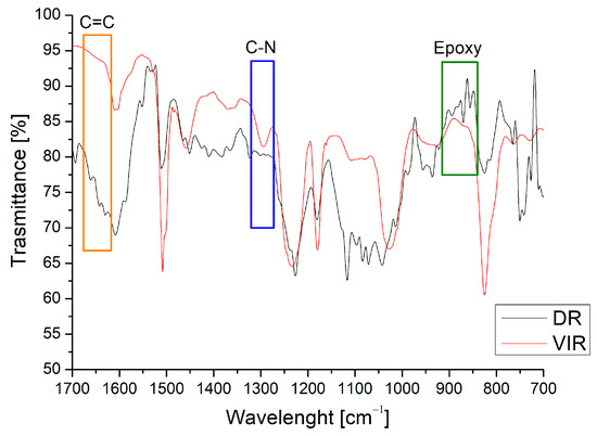 On the other hand, the peaks relative to N-H bending at 1600 cm−1, N-O stretching at 1500 cm−1, and C-N at 1300 cm−1 are only visible on VIR_CR_1. Relevantly, the C-N bond is formed as a consequence of the epoxy ring reaction, as already discussed for Figure 3.