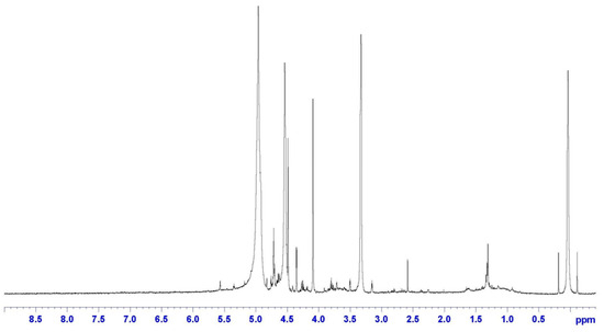 H-NMR analysis was performed with a Bruker Avance III spectrometer (Bruker, Karlsruhe, Germany) operating at 400.13 MHz for a 1H observation and at a temperature of 300.0 K, equipped with a BBI 5 mm inverse detection probe incorporating a z-axis gradient coil. The sample was dissolved in deuterated methanol.